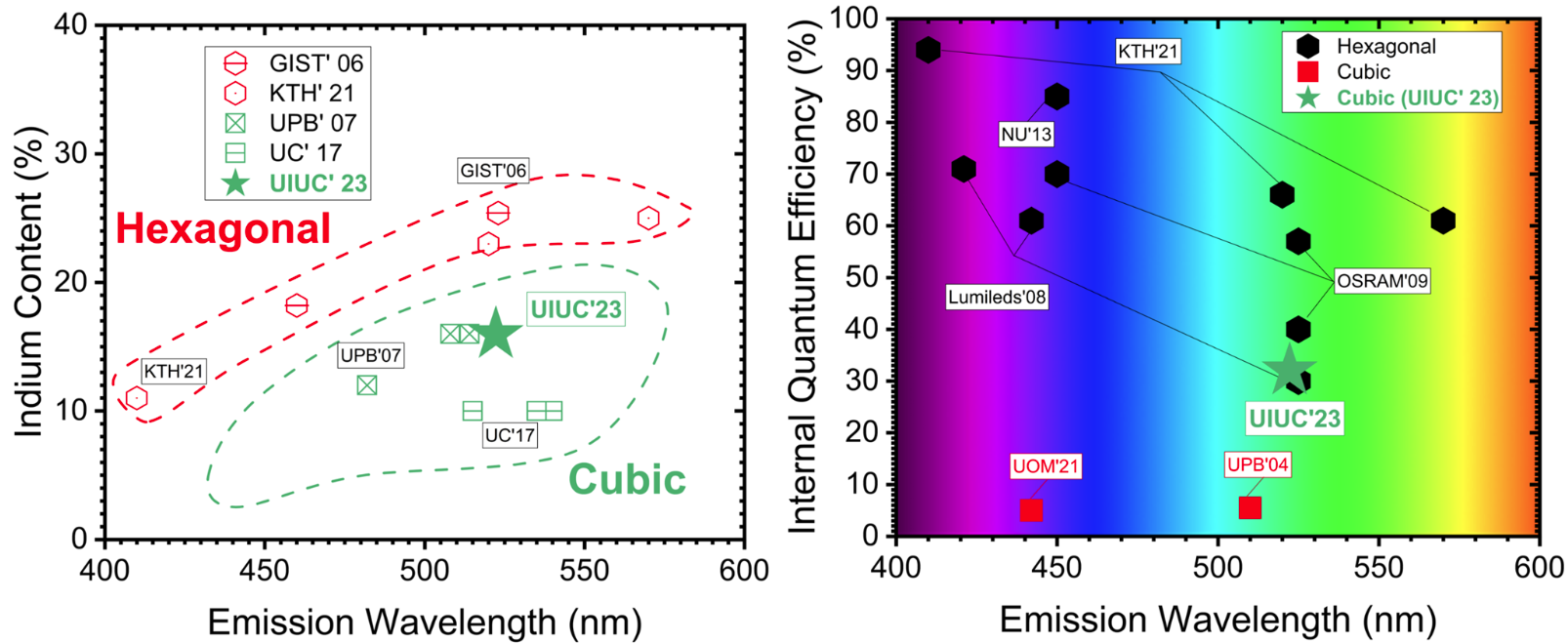 However, many established approaches for green LEDs are plagued with “efficiency droop” at high current densities. Achieving high-efficiency green emission has been difficult with traditional hexagonal III-nitride even with increasing the indium content—a costly element required for green emission—which leads to higher defect densities and efficiency droop. This presents a fundamental challenge for the widespread adoption of SSL.