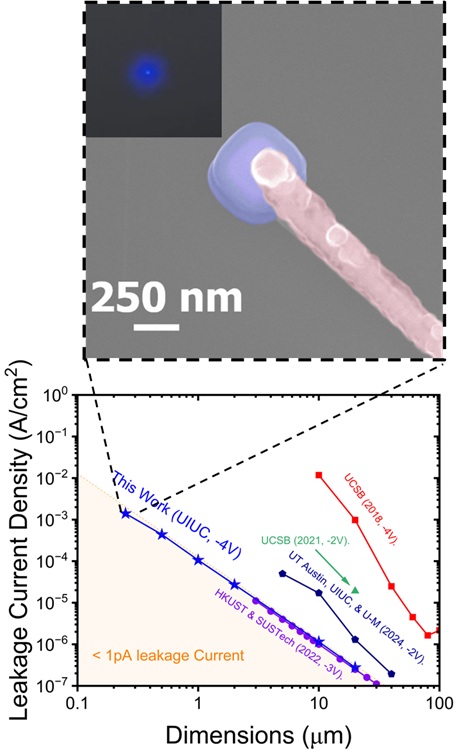 Researchers at the University of Illinois Urbana-Champaign (UIUC) have successfully fabricated blue light-emitting diodes (LEDs) down to an unprecedented 250 nanometers (nm) in size, a critical step for nextgeneration technologies like ultra-high-resolution displays and advanced optical communication. However, their study, published in Applied Physics Letters, reveals a significant challenge: a sharp "efficiency cliff" when these LEDs are scaled to submicron dimensions.
